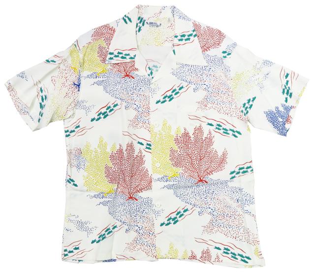 アメリカ本土の生地メーカーもアロハシャツのプリントを手掛けるようになると、彼らはハワイに駐在員を置き、販売網の拡大に乗り出していった。その代表格が敏腕セールスマン、レオ・イスラエルが所属していたコーン・ホール・マークス(COHAMA)。レオは生地のサンプルをスーツケースに詰め、家畜を運搬する船に乗り込んで島々を移動し、生地を売り歩いた。本作はハワイを代表するデザイナー「ジョン・メイグス」がデザインし、COHAMAがプリントした希少価値の高い一枚。メイグス本人も思い入れのあった柄で、実際に着用した写真も残っている。