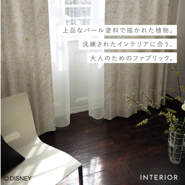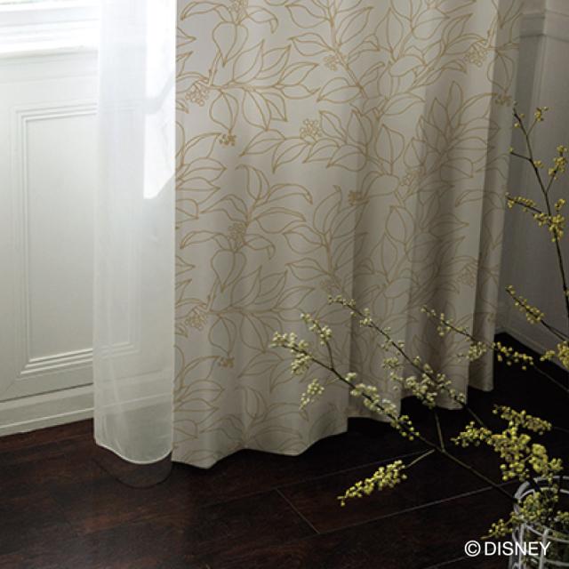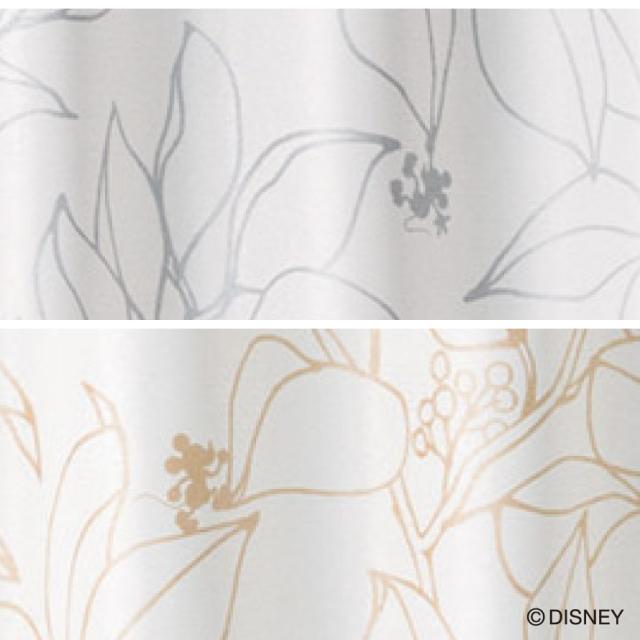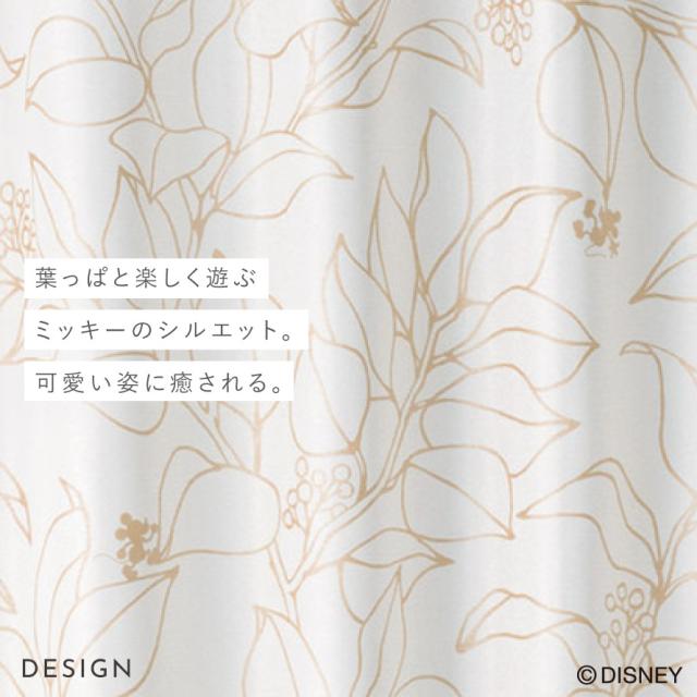 パール顔料が上品なリーフ柄、大人可愛いドレープカーテン。葉っぱの間で遊ぶミッキーに癒される楽しいカーテンです。