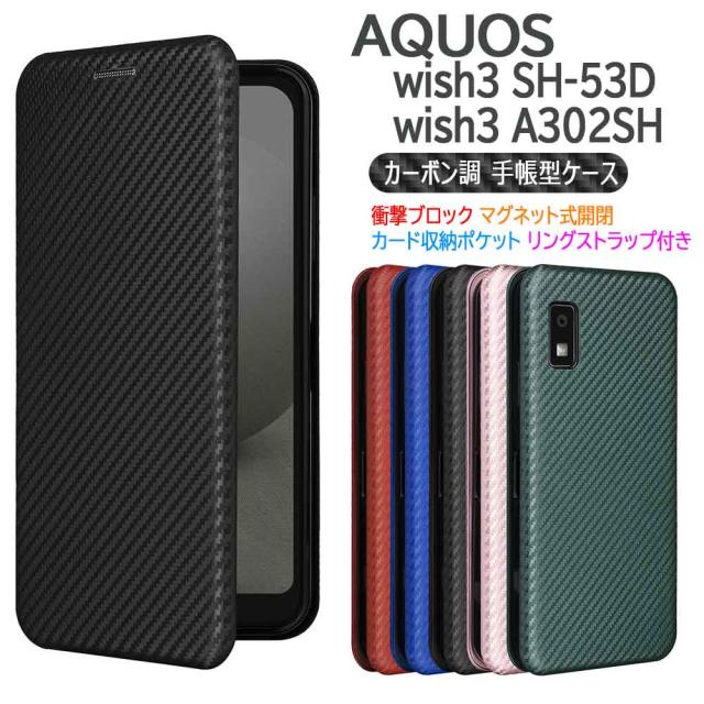 AQUOS wish3 SH-53D A302SH スマホケース 手帳型 カーボンデザイン マグネット式 カード収納 アクオスウィッシュ