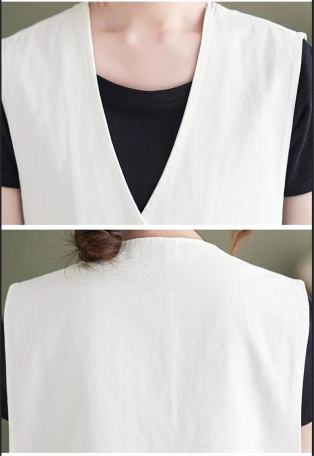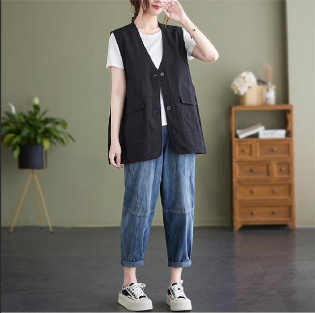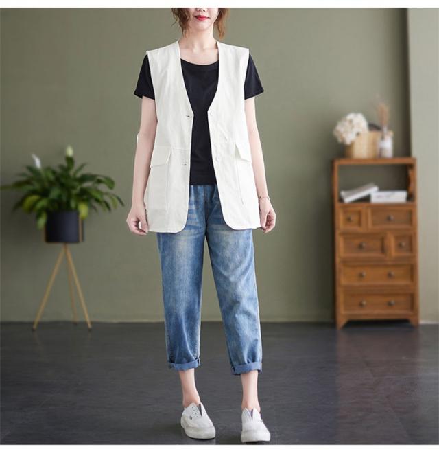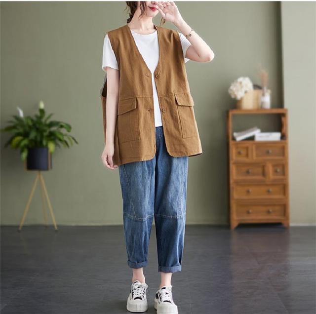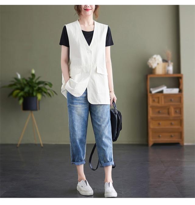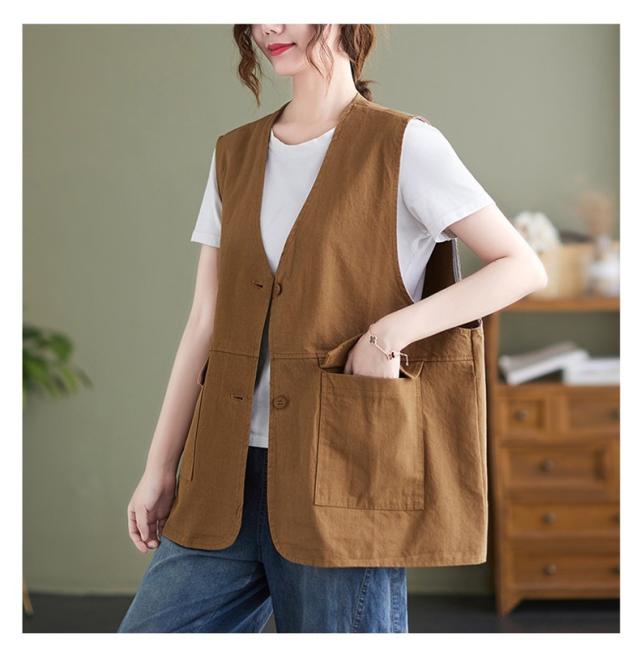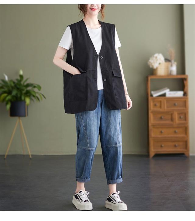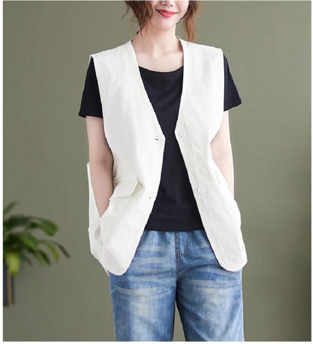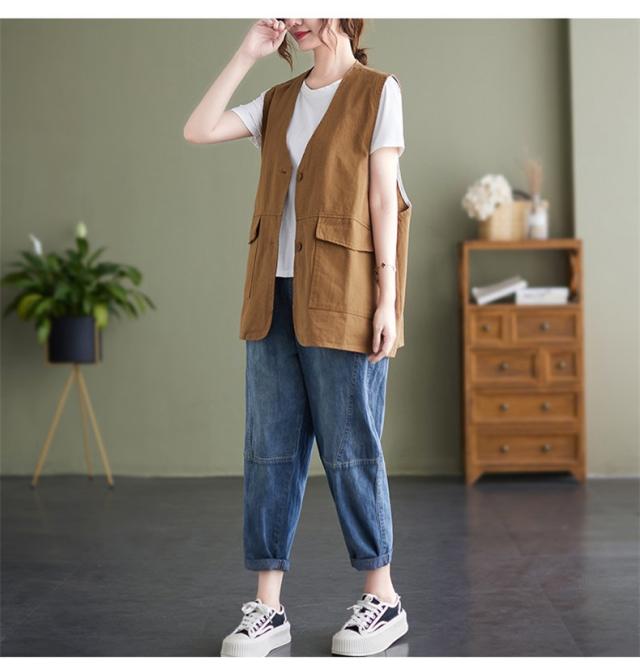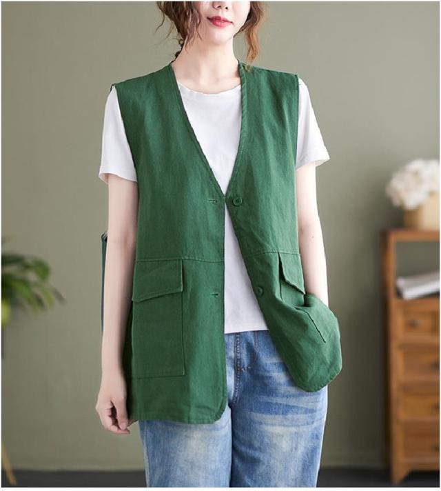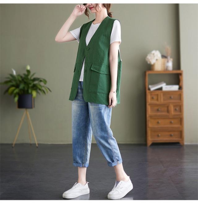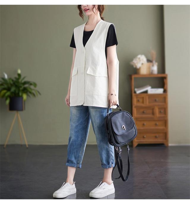 夏新作 ベスト レディース ジレベスト コットン ポリエステル Vネック ロングベスト 無地 ポケット付き ノースリーブ 大きいサイズ