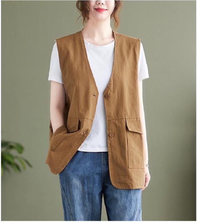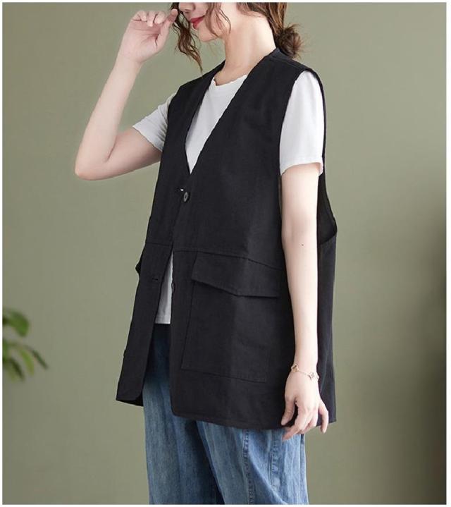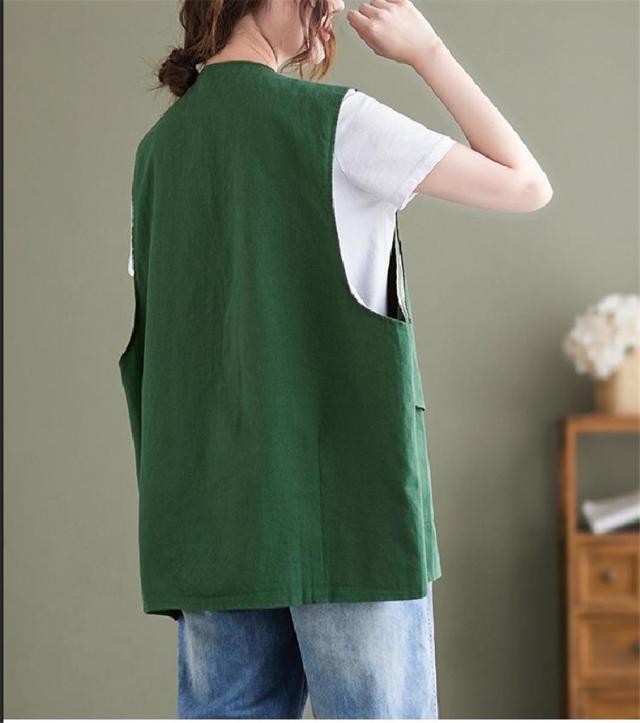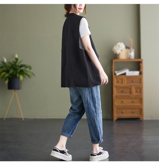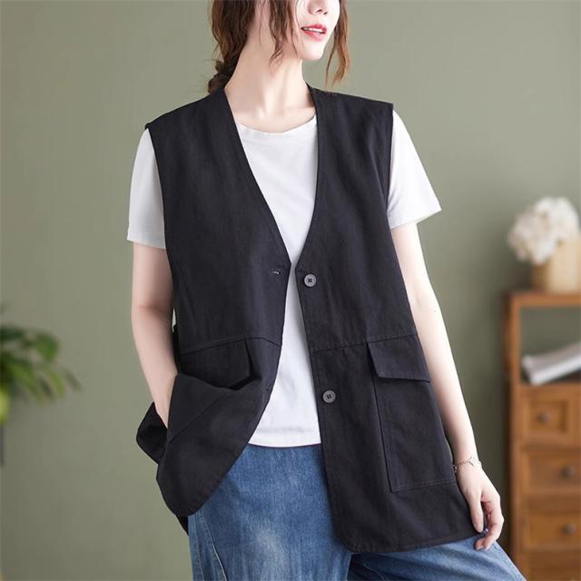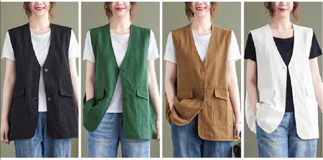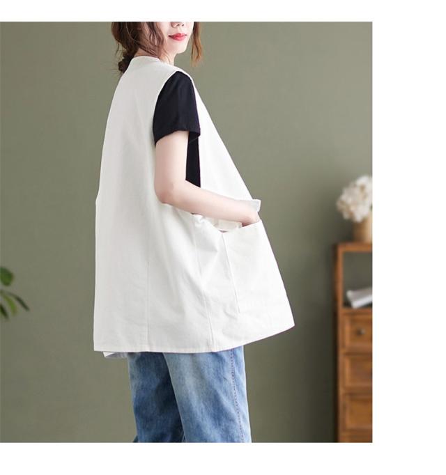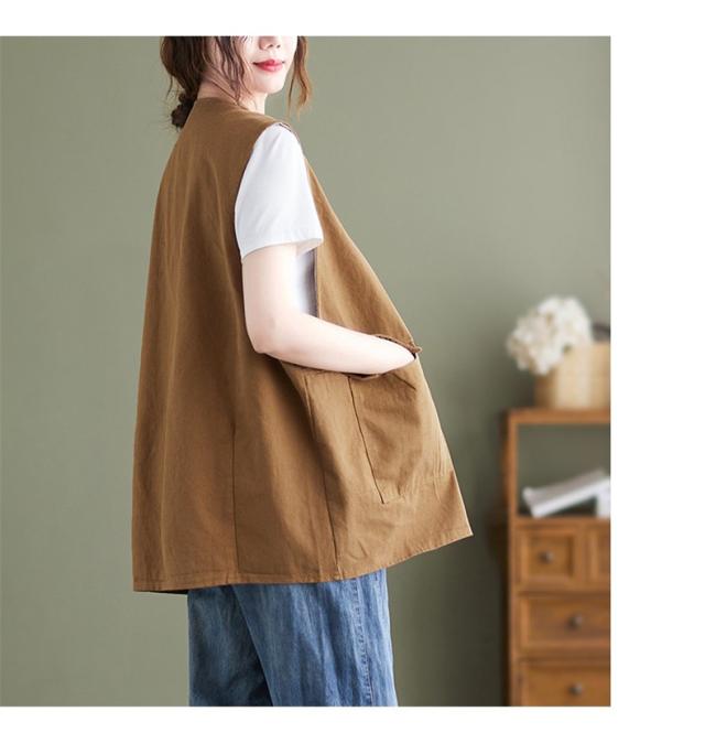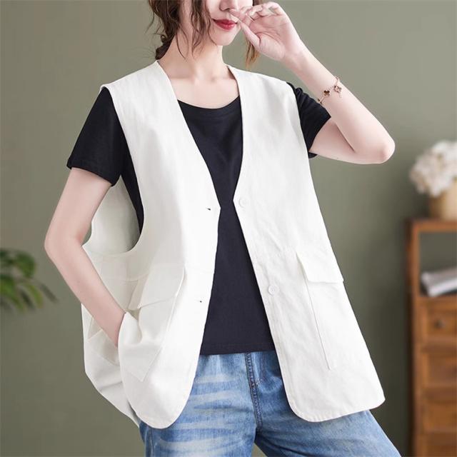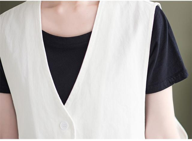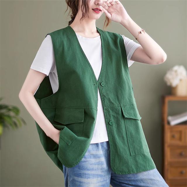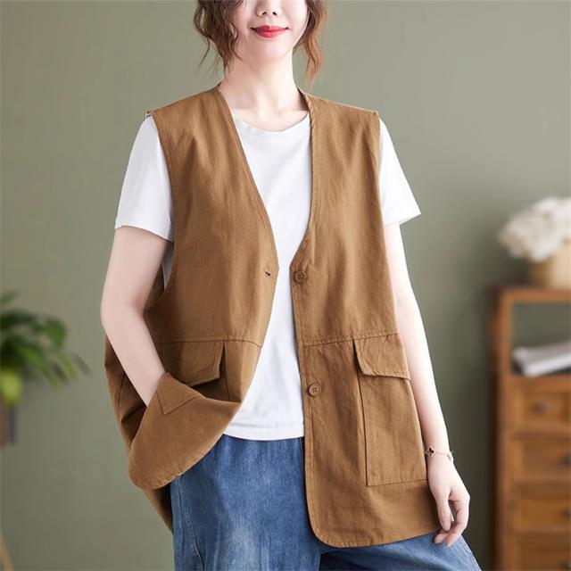 夏新作 ベスト レディース ジレベスト コットン ポリエステル Vネック ロングベスト 無地 ポケット付き ノースリーブ 大きいサイズ