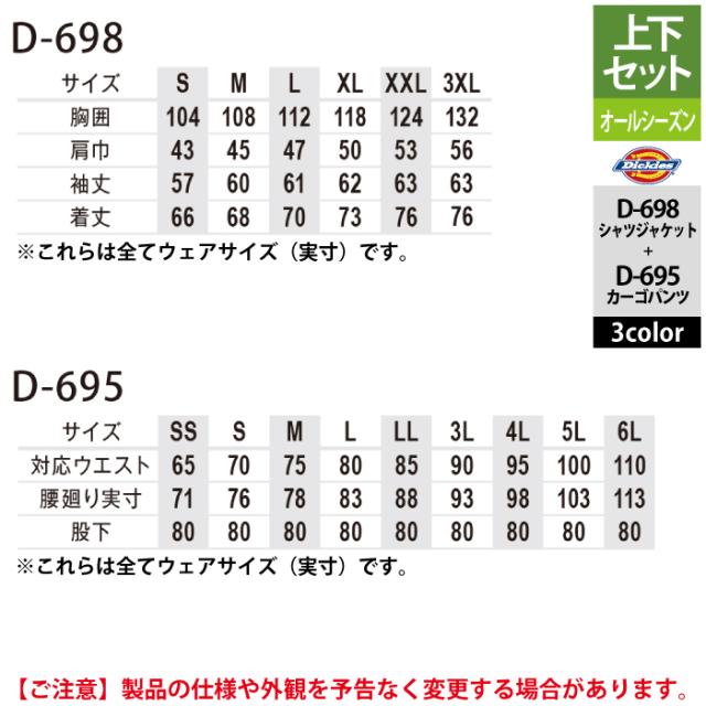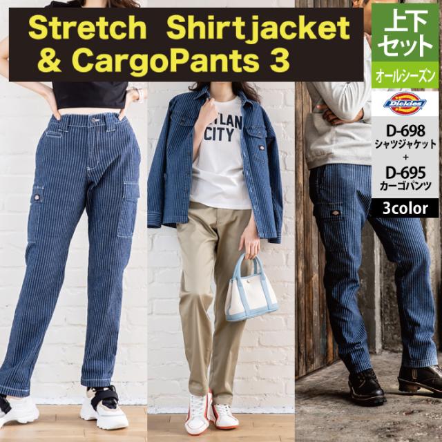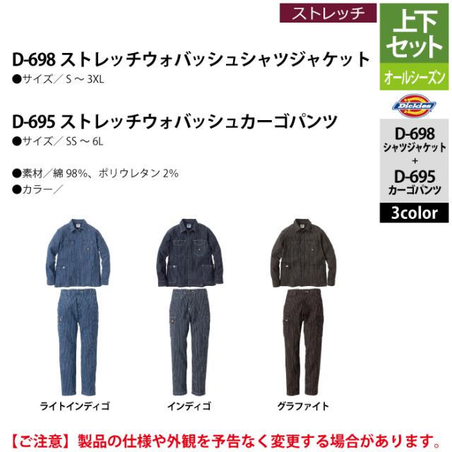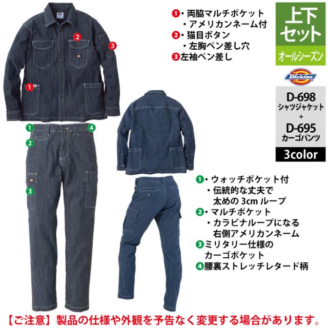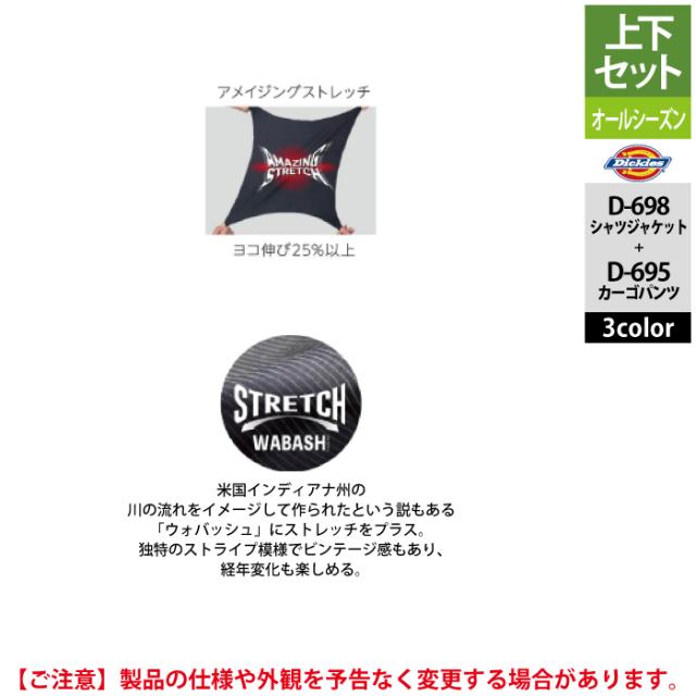 ディッキーズ Dickies 作業服 作業着 オールシーズン 上下セット D-698 ストレッチウォバッシュシャツジャケットS-3XL と D-695 カーゴパンツ SS-6L