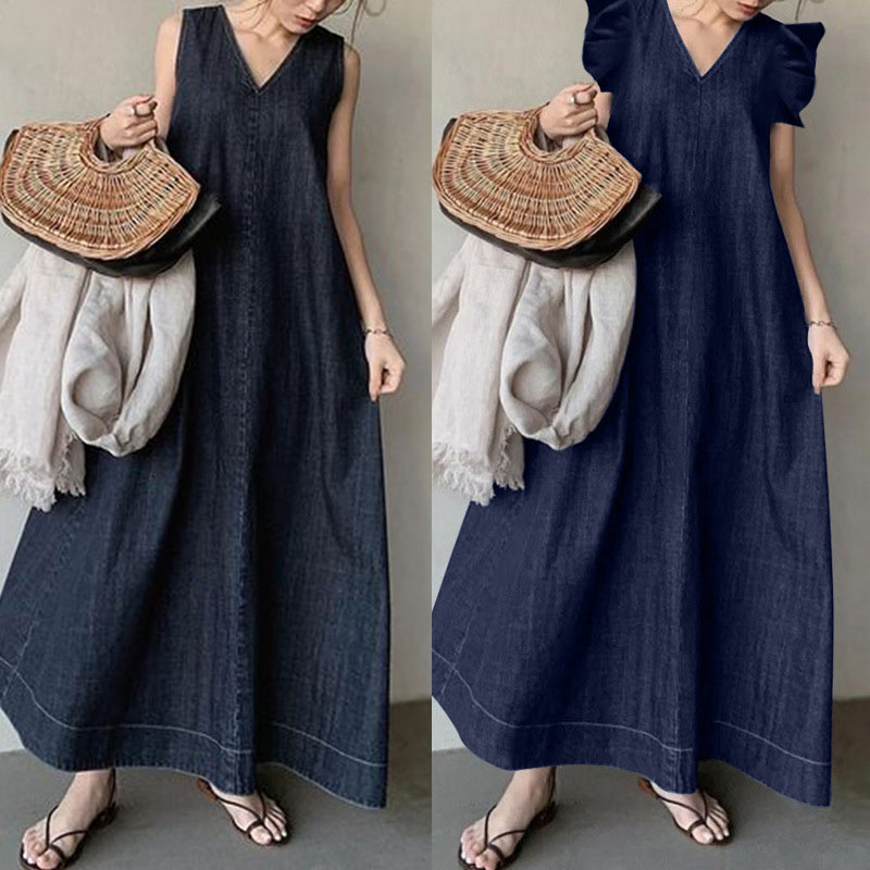 ワンピース レディース ロングワンピース ロング丈 春夏 フレア袖 ワンピ ロング丈 Vネック デニムワンピース デニム バックリボン 体型カバー