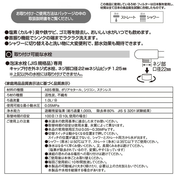 浄水器 360度回転 首振り浄水器 ストレート切り替え シャワー切り替え 浄水シャワーヘッド 節水浄水蛇口 カビ臭除去フィルター カルキ臭除去フィルター 泡沫水栓 鉄さび除去 ゴミ除去 簡単取付 原水浄水切り替え 台所用 キッチン用 料理用 野菜洗い用 米研ぎ用 お茶用 コーヒー用 赤ちゃんのミルク用 ペットの飲み水用 水槽 観葉植物 一人暮らし 新生活 賃貸物件 ファミリー向け 安心 安全 自炊用 美味しい水 節約 時短家事 残留塩素除去 コスパ 飲料水浄化 健康志向 工具不要 衛生的 水質改善 飲料水安心 抗菌仕様 節約 シンプル おすすめ 便利 使いやすい PFAS 4971605030913