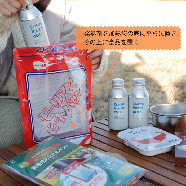 少量の水を注ぐとすぐ発熱し、火や電気を使わず飲食物を加熱できる発熱剤と加熱用袋のセット。