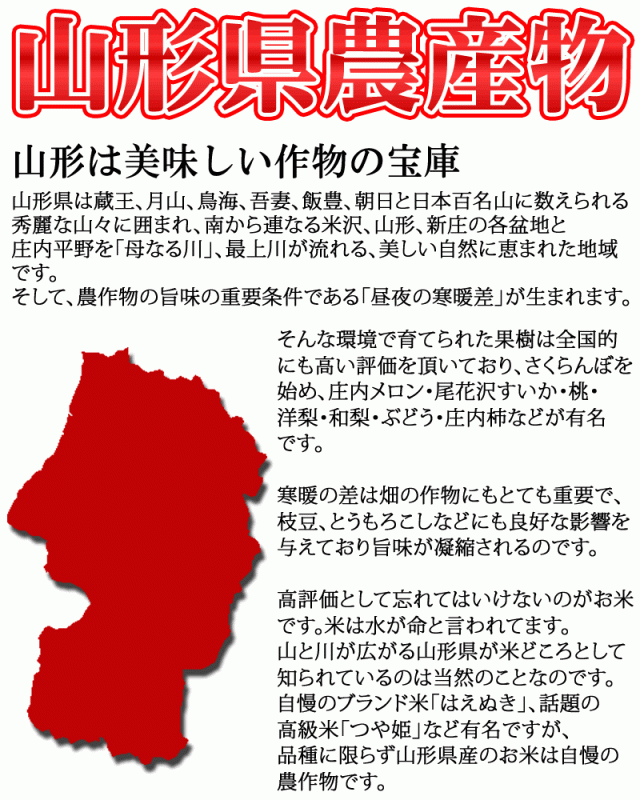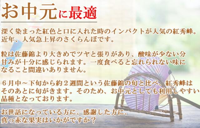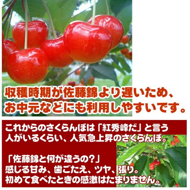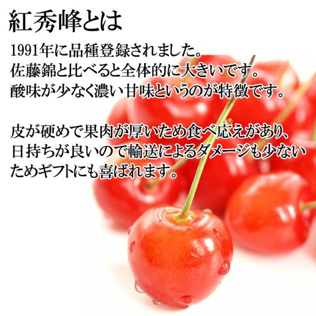 ここ数年で佐藤錦を凌ぐ人気の「紅秀峰」大きさ、ツヤ、紅色の見た目でビックリ!口に入れて、その甘さ、歯ごたえに驚愕し、感激を覚えること間違いなし!そんな、人気急上昇中の品種「紅秀峰」をお届けします。さくらんぼ好きな方、佐藤錦しか食べたことがない方、驚きを誰かにプレゼントしたい方。全ての要望にお応え出来るでしょう! ●注意事項 ・6月中頃より発送予定です。7月上旬までには発送を完了する見込みとなります。※天候の変化により前後することがございます。 天候に左右されやすい農産物のため、 発売日は目安の日にちとなります。ご了承ください。・九州地方への発送につきましては別途送料500円を頂戴しております。沖縄県への発送につきましては別途送料1000円を頂戴しております。・クレジットカードにてお支払いの場合には有効期限が2026年8月以降のカードをご使用ください。発送前に有効期限が切れてしまっている場合には別途ご連絡させていただきます。・配達希望日非対応の商品となります。希望日を頂きましてもお応え出来ない場合がございますことをご了承ください。・佐藤錦とは発送時期が異なりますので、同梱は出来ませんことをご了承ください。