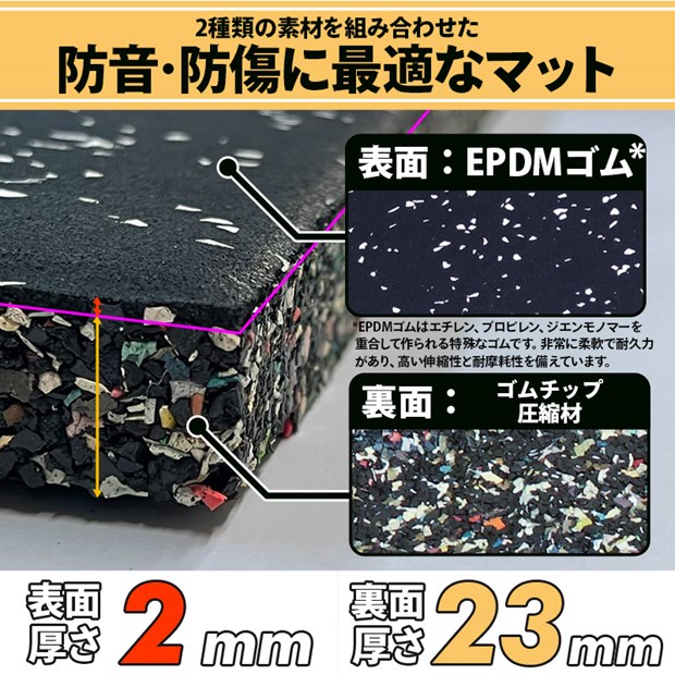 表面は厚さ2mmのEPDMゴムシート、裏面は厚さ23mmゴムチップ圧縮材の2層構造です。