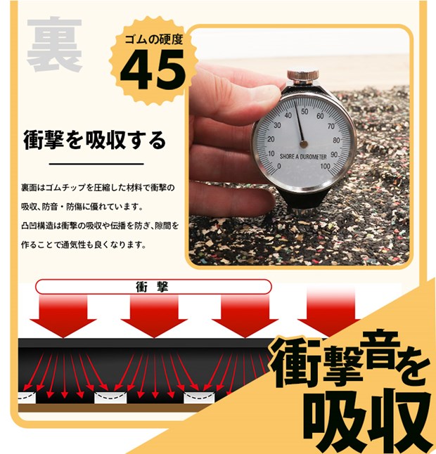 裏面はゴムチップを圧縮した材料で衝撃の吸収、防音・防振に優れています。硬度は45です。凸凹構造は衝撃の吸収や伝播を防ぎ、隙間を作ることで通気性も良くなります。