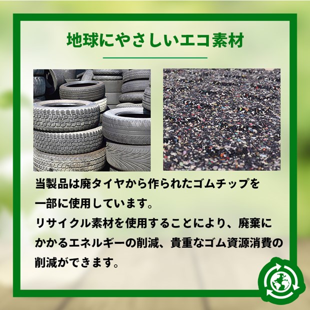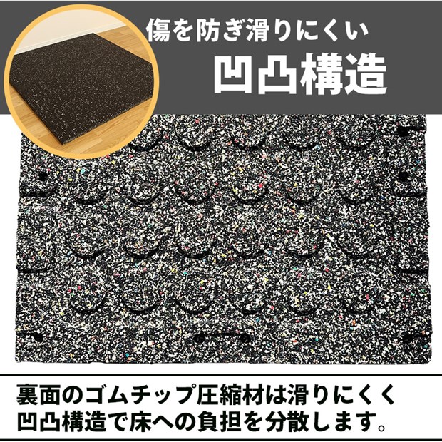 ゴムチップ圧縮材を使った裏面は滑りにくく、凹凸構造で床への負担を分散します。