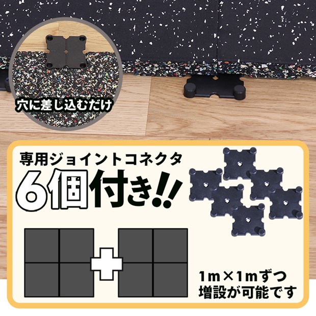 裏面の穴に差し込むだけの専用ジョイントコネクタが6個付属しています。1m×1mずつ増設が可能です。