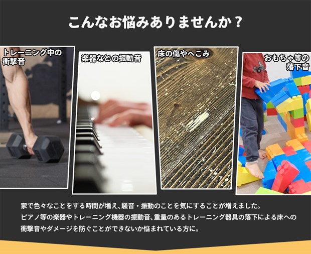 ピアノ等の楽器やトレーニング機器の振動音、重量のあるトレーニング器具の落下による床への衝撃音やダメージを防ぐことができないか悩まれている方に。その悩みを防音マットが解決します。