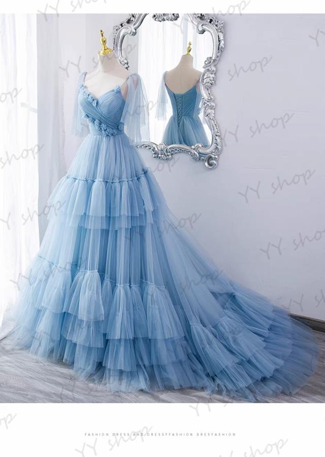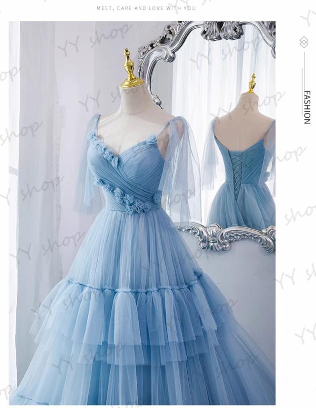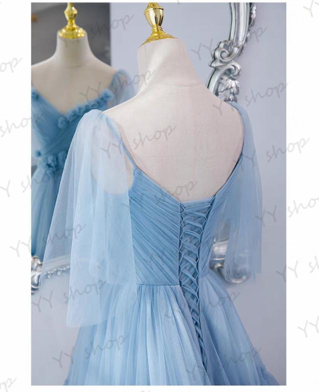 新作 ロングドレス パーティドレス ワンピース カラードレス チュールスカート トレーン 青 結婚式 二次会 舞台 発表会 撮影 ブルー D133