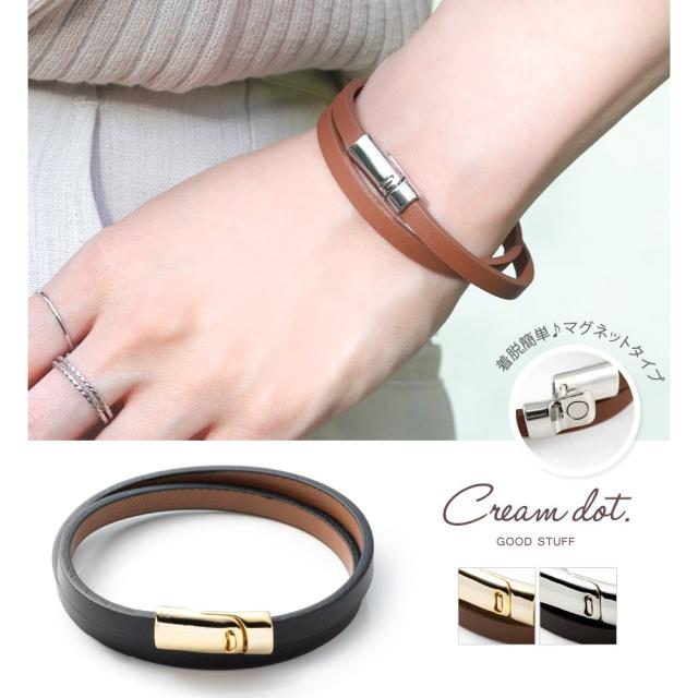 どんなコーデにもマッチするベーシックな本革ブレスレット。2連で程よいボリュームを出せて手元のお洒落に活躍します。マグネット式だからパチッとワンタッチで留めるだけで着脱も簡単!経年変化もお楽しみ頂けます。