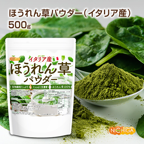 ほうれん草パウダー(イタリア産) 500g 【メール便専用品】【送料無料】 契約農家管理品 食物繊維たっぷり たんぱく質豊富 [05] NICHIGA(ニチガ) 着色料不使用 甘味料不使用 保存料不使用