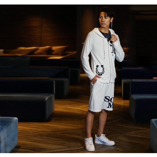 SOMEDIFF(サムディフ)『フェザーヤーンジャガードショーツ』【フェザーヤーンジャガードショーツ】■Design/デザインリッチな素材で優雅に穿きこなすサーフテイストなショートパンツ。毛足の長いフェザーヤーンを使用しなめらかかつ、サラリとした極上の肌触りが特徴のアイテムで、優雅な品の良さを演出してくれる。フロントやバック部分にロゴデザインを施し、主張しすぎないデザイン性を演出しているのもポイント。スリムなサイジングでだらしなさを抑え上品なオトナの佇まいを演出。軽妙に穿きこなすハーフパンツで品よく遊べ。