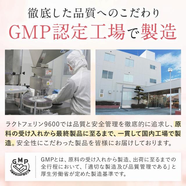 ラクトフェリン9600では品質と安全管理を徹底的に追求し、原料の受け入れから最終製品に至るまで、一貫して国内工場で製造。安全性にこだわった製品を皆様にお届けしております。