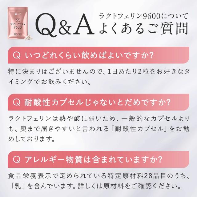 原材料名:デキストリン(国内製造)/ラクトフェリン抽出物(乳由来)、HPMC、ステアリン酸カルシウム、微粒酸化ケイ素、ゲル化剤(ジェランガム)