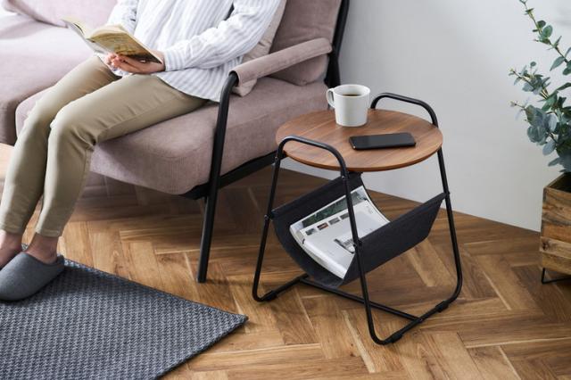 木、スチール、ファブリックをミックスしたサイドテーブルです。丸い天板と布棚はお部屋をかわいらしく演出します。天板下の布棚はブランケットやワインなどを収納できます。天板はメラミン樹脂加工で熱や水、汚れに強くお手入れが簡単です。場所を選ばずお使いいただけます。ベッドサイドやソファ横などに置けるコンパクトなサイズです。フレームは取っ手のような形状で持ち運びしやすい設計です。お客様組み立てとなります。