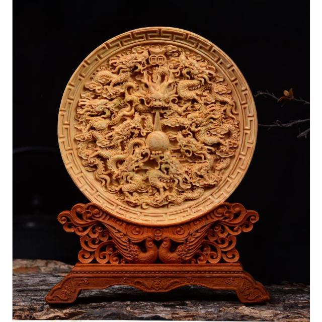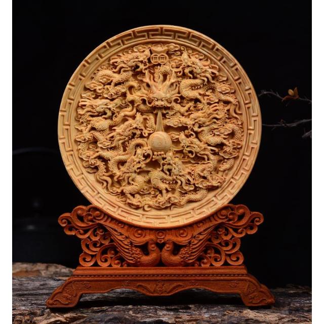 お皿状の天然木に細部まで彫りこまれた龍神と鳳凰の皿型置物です