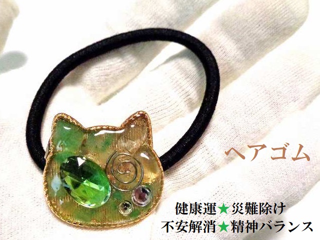 健康・ツキとチャンス・恋愛運・癒し・自然界エネルギー・人間関係向上・不安解消★アベンチュリン・プレナイト★ヘアゴム★猫・ねこ・ネコ★オルゴナイト★パワーストーン★護符(霊符)