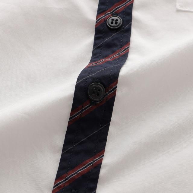 シンプルなデザインに加えて、前立てにレジメンタルストライプを切り替えたデザインは、ジャケットなどを羽織った際もさりげないアクセントに♪