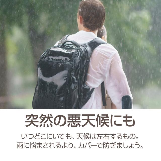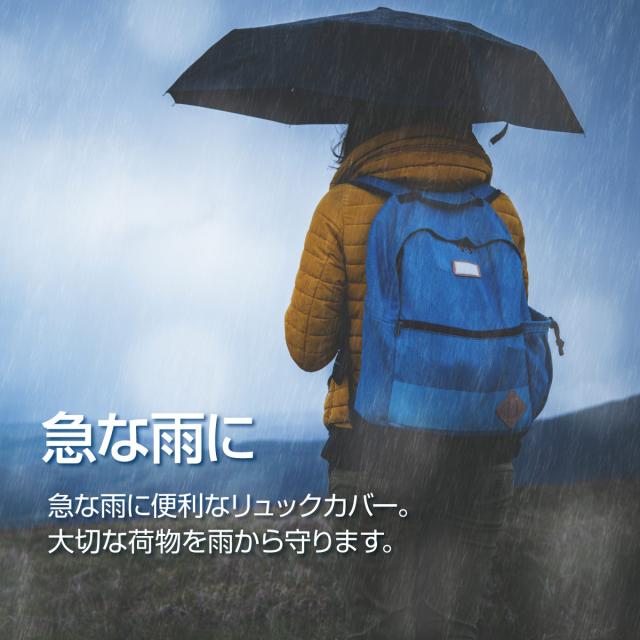 【急な雨に】急な雨に便利なリュックカバー。大切な荷物を雨から守ります。