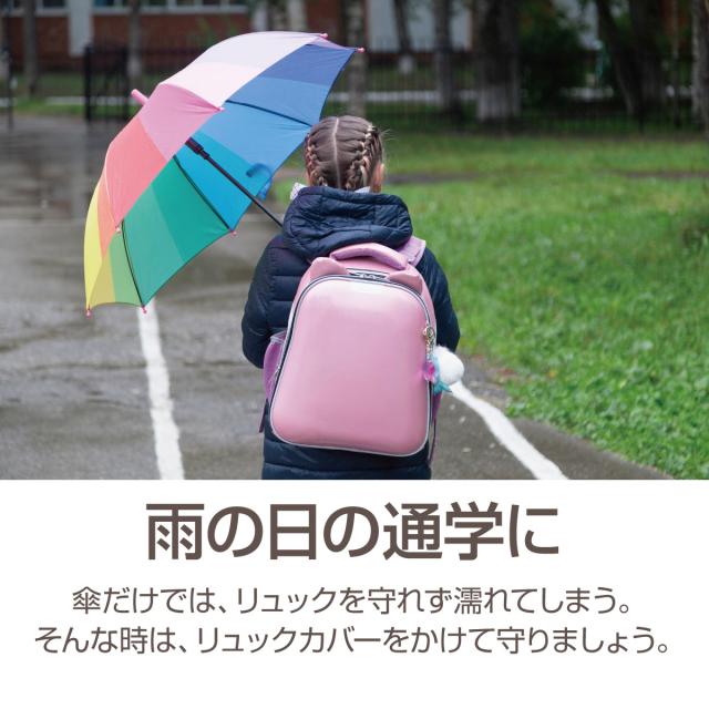 【雨の日の通学に】傘だけでは、リュックを守れず濡れてします。そんな時は、リュックカバーをかけて守りましょう。