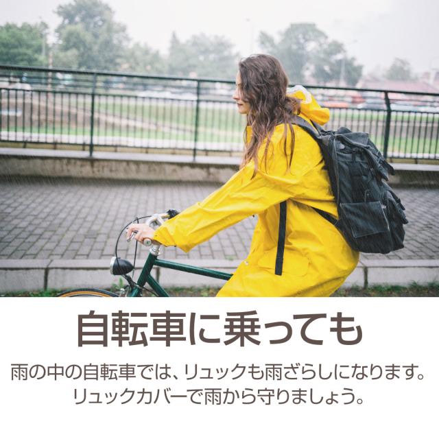 【自転車に乗っても】雨の中の自転車では、リュックも雨ざらしになります。リュックカバーで雨から守りましょう。