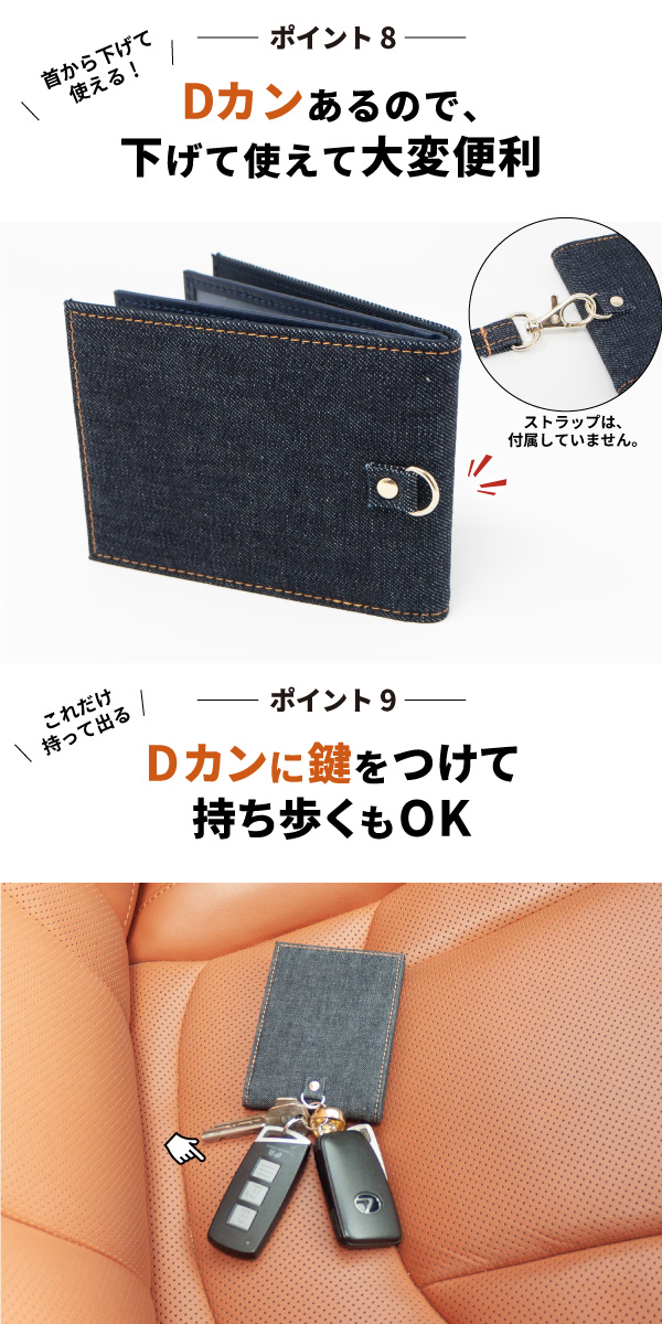 - 顔写真付き自動車免許証、資格証明など入れるケースと、カードなどが入れるポケットがあり、コンパクトに持て良い感じです。私は、お守りも入れてます。デニムなので丈夫な感じです。縫製も、きちんとしてます。商品の入ってた箱が立派でした。もう少しだけ価格が安価だと購入しやすいと思います。