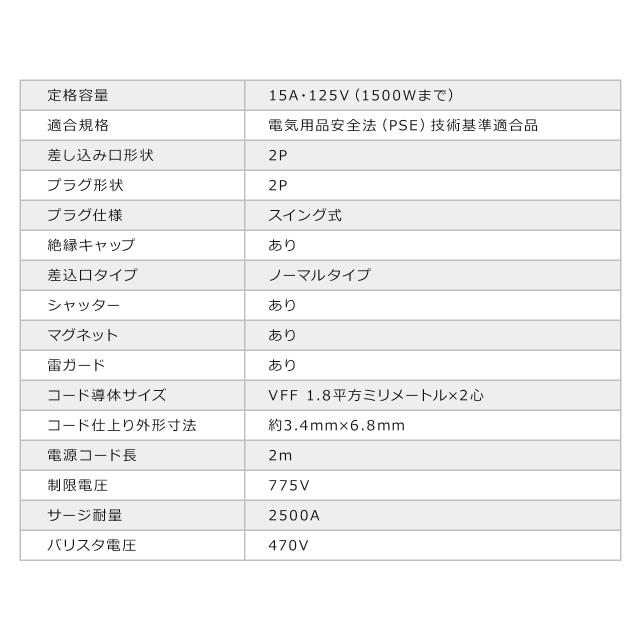 ●プラグ形状が2Pで、差し込み口が3個口の電源タップです。●雷ガードを内蔵しており、接続機器を雷から守ります。雷ガード作動中は確認ランプが点灯します。
