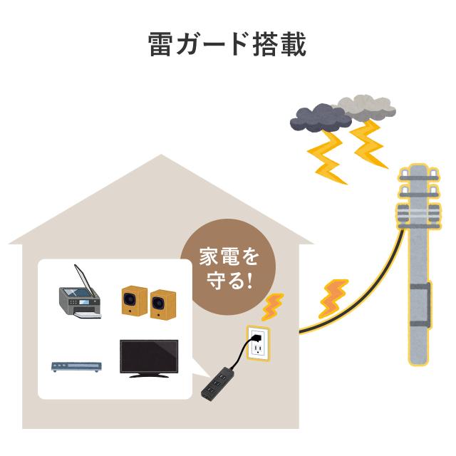 ●プラグ形状が2Pで、差し込み口が4個口の電源タップです。●雷ガードを内蔵しており、接続機器を雷から守ります。雷ガード作動中は確認ランプが点灯します。