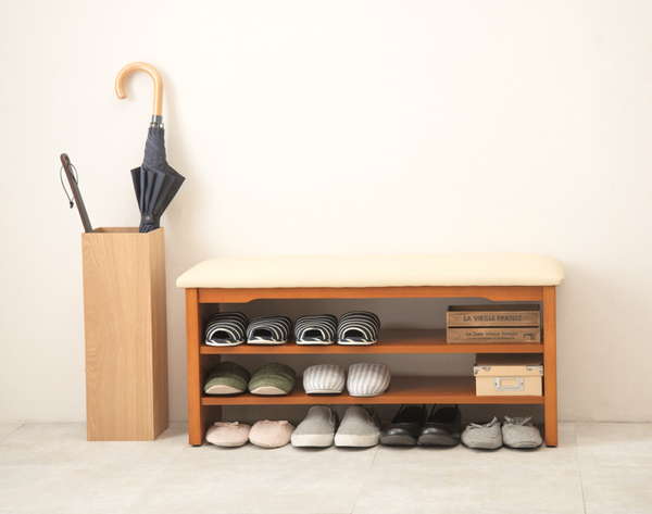 ●靴の脱ぎ履きに便利なシンプルデザインの玄関ベンチ。