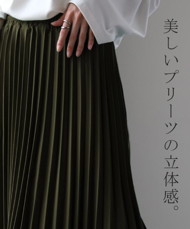 広がり過ぎないシルエットとプリーツの縦ライン効果ですっきり体型カバーも。
