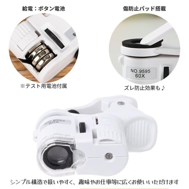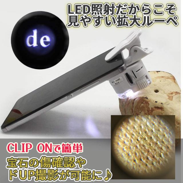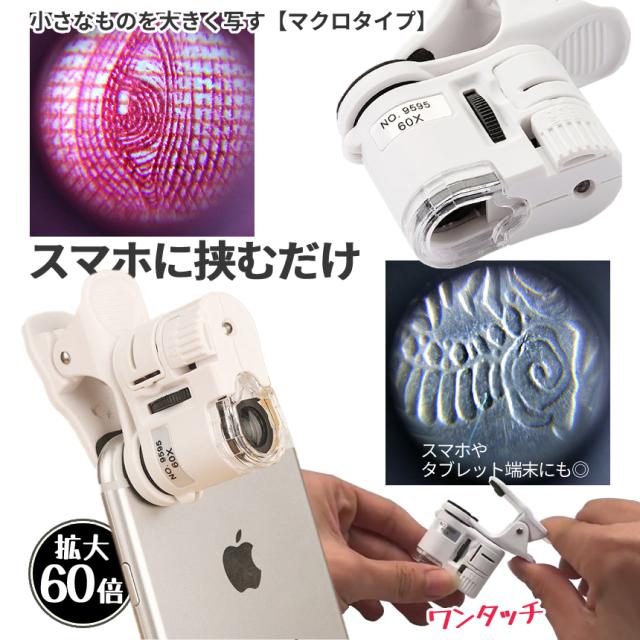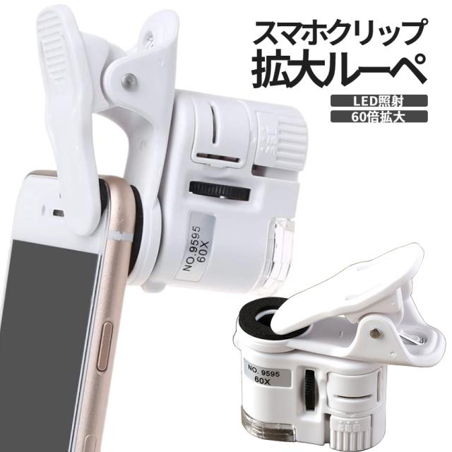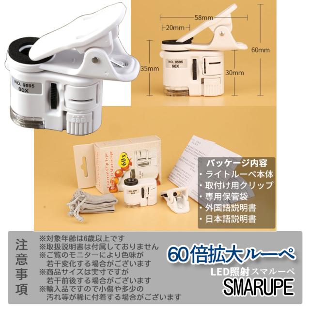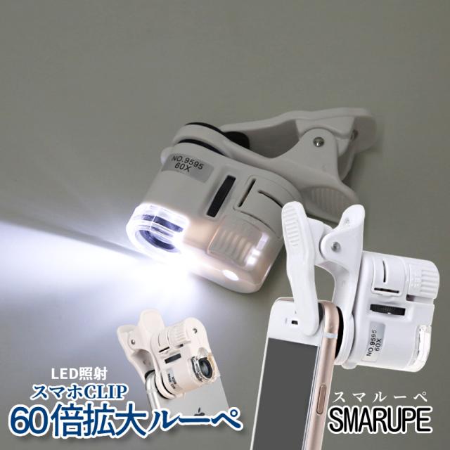スマホ用 ルーペ 60倍 拡大 LED ライト クリップ 拡大鏡 スマホルーペ スマホ 装着 近接 マクロ 撮影 宝石 鑑定 傷 確認 紙幣 SNS 投稿 観察 アップ ズーム 1000円 均一 ポッキリ SMARUPE 送料無料