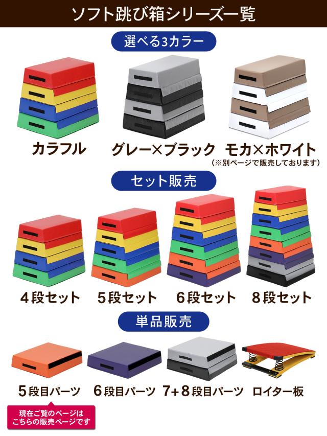 【拡張性が高いから成長に合わせて使い分けが出来る】ソフト跳び箱シリーズは4〜8段までご利用出来ます。5段セットを買った人も追加で購入出来るように単品販売も行っております。
