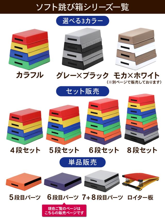 【拡張性が高いから成長に合わせて使い分けが出来る】ソフト跳び箱シリーズは4〜8段までご利用出来ます。5段セットを買った人も追加で購入出来るように単品販売も行っております。