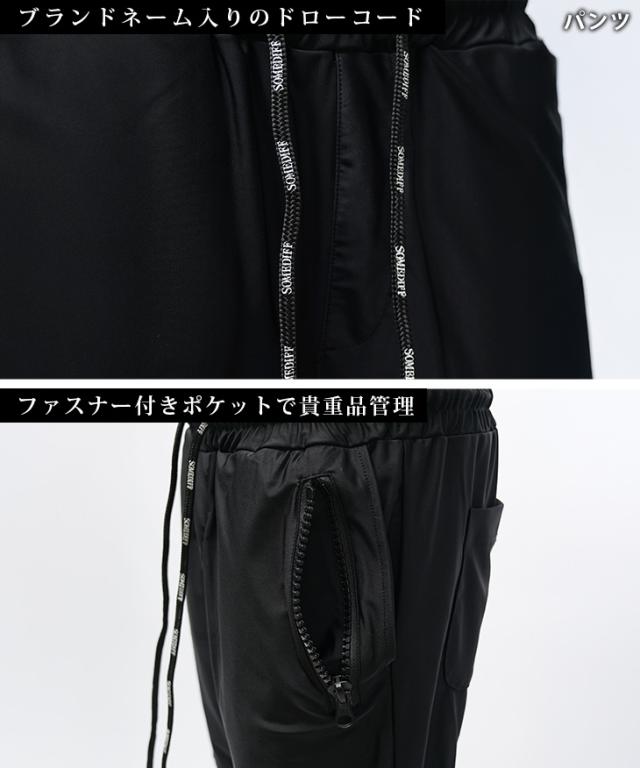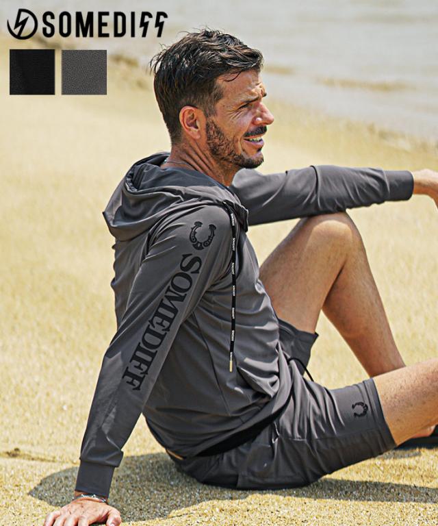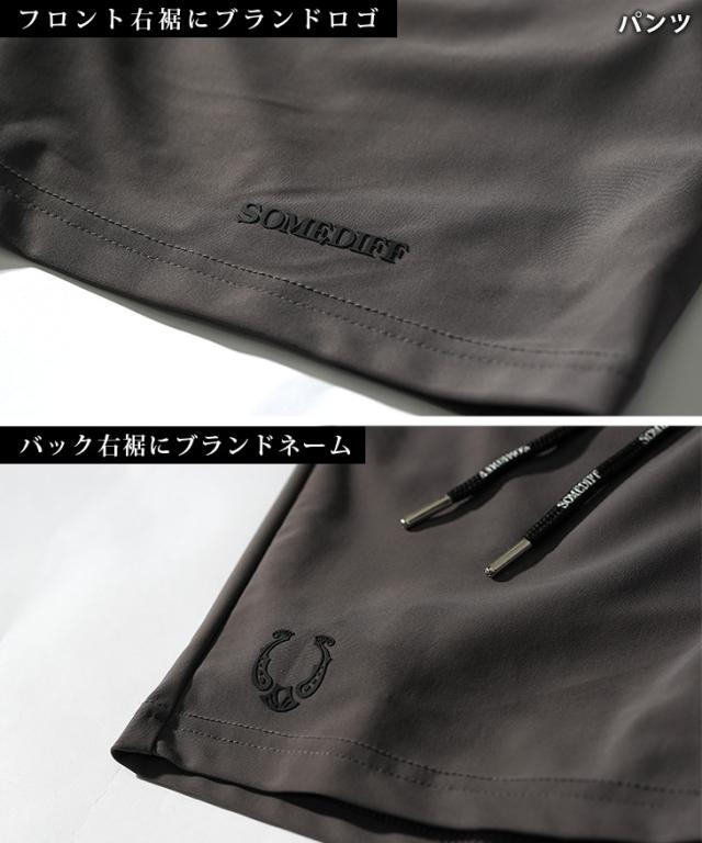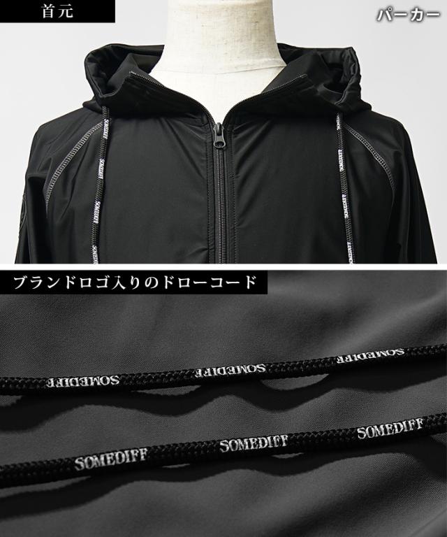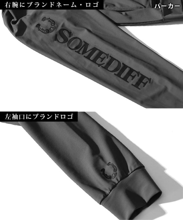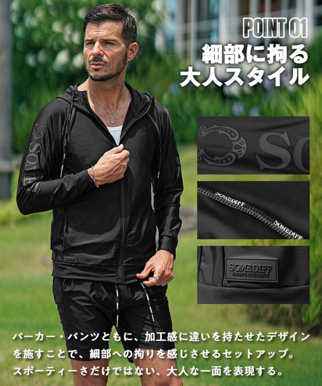 SOMEDIFF(サムディフ)『コンプレッションパーカーセットアップ』【コンプレッションセットアップ】■Design/デザイン軽快な夏を演出するZIPパーカーとショートパンツのコンプレッションセットアップ。着圧により動きをサポートするコンプレッションウェアならではのスリムフィットなサイジングで軽快な装いに仕上がる。抜群の伸縮性も相まって、海などアクティブなシーンの頼れる味方に。パーカーの袖部分とショーツの右裾部分にはブランドネームをデザイン。パーカー右裾部分にはラバーピスネームを、ショーツ左ポケット部分はファスナーデザインを配置。フード紐部分にもデザインを取り入れ遊び心ある洒落感を演出。小粋に魅せるスポーティなコーデで夏を彩る。