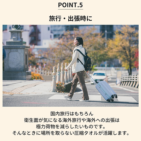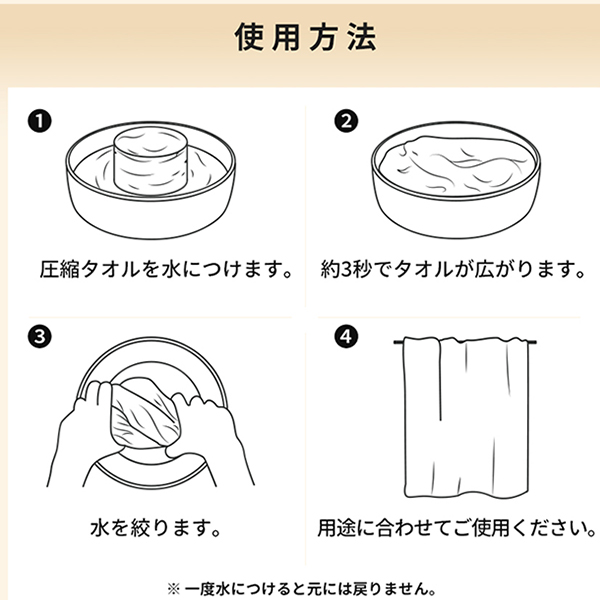 | 商品説明 | 小さくても大きな力を秘めた圧縮タオル】 圧縮タオルは旅行やアウトドア、防災時に大活躍する便利アイテムです。コンパクトながらもたっぷり吸水、なめらかな感触が特徴で、 100%植物繊維使用で肌にも優しいです。個包装で衛生的、緊急時にも役立つ圧縮タオルは、様々なシーンで欠かせないアイテムとなります。 【持ち運びが簡単】 圧縮タオルは小さく折りたたまれていて、非常にコンパクトな形状になっています。 これにより旅行や外出時にカバンの中にすっきりと収納することが可能で場所をとらずに持ち運びができます。 【衛生的】 各タオルは個別に包装されているため、使用するまで清潔さを保つことができます。公共の場所や旅行中に特に便利です。 【緊急時に便利】 予期しない事態や緊急時に、いつでも新しいタオルを使用することができます。 災害用品としてストックしておくことも一つの選択肢です。 【プレゼントや記念品】 圧縮タオルは、そのユニークな形状と便利さから、ギフトや記念品としても適しています。 【圧縮タオルの特徴】 小さくても大きな力を秘めた圧縮タオル。 旅行、アウトドア、急な出張、さらには災害時にも大活躍する、これ一つで多くのシチュエーションに対応可能なタオルです。 その優れた機能性と便利さから、あなたの生活に絶対欠かせないこと間違いなしです。 【便利な持ち運び】 旅行好きで、トラベルタオルを探しているなら、この圧縮タオルはピッタリです。 非常にコンパクトなサイズで場所を取らず、いつでもどこでも手軽に持ち運びが可能です。 さらに緊急時や災害時にも役立つ頼れるアイテムで、いざという時にはこのコンパクトなタオルが大活躍します。 【600px 植物繊維使用】 自然素材を好み柔らかいタオルを求めているなら、このタオルはその期待を裏切りません。 600px植物繊維から作られており、その吸水性となめらかな感触は一度使うと手放せなくなるほど。 エンボス加工により、毛羽立つこともありません。 【個別包装】 各圧縮タオルは個別に包装されています。 清潔で使いたいときにすぐに使うことが可能です。また、使い捨てタオルとしても活用いただけます。 【圧縮タオルの適切な使用シーン】 ■旅行・出張時 旅行や出張時には、荷物を少なくしたいと思うもの。圧縮タオルは非常にコンパクトなので、スーツケースやバッグの中でも場所を取りません。 また、ホテルや旅館で提供されるタオルが肌に合わないという人にもおすすめです。ただし、一度水につけて広げると元の小さな形には戻らないので、 使用後は普通のタオルと同じように扱う必要があります。 ■防災時 防災グッズとしても圧縮タオルは有効です。非常時には水と一緒に持ち運べば、いつでも清潔なタオルを使用することができます。 ただし、保存する場合は湿気のない場所に保管し、有効期限を確認することが大切です。 ■アウトドア キャンプやハイキングなどのアウトドア活動にも圧縮タオルは便利です。軽量で場所を取らないので、持ち運びが楽で、汗を拭いたり、 手を清潔に保つのに役立ちます。ただし、自然環境を守るために、使用後のタオルは必ず持ち帰るようにしましょう。 ■介護 介護の現場でも圧縮タオルは役立ちます。入浴が難しい高齢者の方の体を温かいタオルで拭くときなどに使用できます。 ただし、肌がデリケートな方に使用する場合は、肌に合うかを確認した上で使用しましょう。 【圧縮タオルの適切な使用シーン】 1:圧縮タオルを水につけます。 2:約3秒でタオルが広がります。 3:水を絞ります。 4:用途に合わせてご使用ください。 お風呂上がりのバスタオルの代わり、海やプールでのアウトドア時にはビーチタオルの代わり、非常時や災害時には速乾タオルの代わり、 旅行や出張時でのトラベルタオルの代わり、介護やお掃除等にも使えます。様々なシーンでこの圧縮タオルがあなたの生活に役立ちます。 注: 一度水につけると元には戻りません。 圧縮タオルは、その便利さと機能性から多くの人々に愛用されています。 場所を取らずに持ち運びやすく旅行やアウトドア、防災時などに大活躍します。また、100%植物繊維を使用しているため、 肌にやさしく、安心してお使いいただけます。これからも、圧縮タオルがあなたの生活をより快適に、より便利にするお手伝いをしていきます。 【商品仕様】 圧縮フェイスタオル 6枚入(個別包装) 圧縮時のサイズ:(約)直径4.5×厚み1.3(cm) 広げた時のサイズ:(約)縦60×横30(cm) 重さ:15.6g 圧縮バスタオル 1枚入 圧縮時のサイズ:(約)直径9×厚み1.9(cm) 広げた時のサイズ:(約)縦140×横70(cm) 重さ:85g 素材は食物繊維素(セロロース)を使用 圧縮タオルは、その小ささと多機能性で生活の様々なシチュエーションに対応します。 持ち運びやすさ、吸水性、そして肌触りの良さを兼ね備えたこのタオルは、あなたの日常生活をより豊かで 快適なものにするための強力なパートナーです。旅行や