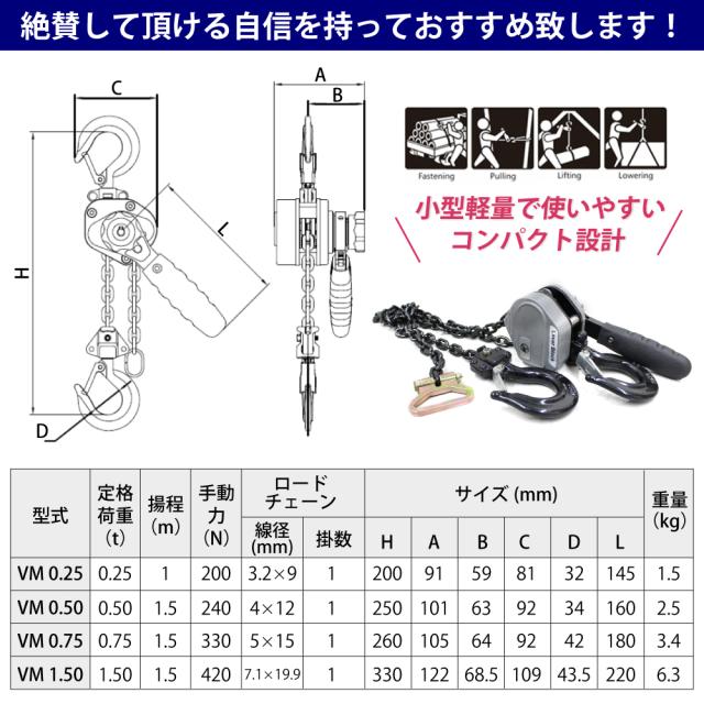 商品名:軽量小型レバーホイスト VMシリーズ VM 1.5t lh-vm150商品の説明好評につき新サイズ販売開始。●早戻しが簡単。作業効率も一段とアップ。 無負荷時に切り替えレバーを中央の位置(N)にするだけで自動空転になり、チェーンの右側、左側の長さ調節ができます。 よりスムーズで高効率操作性を実現、プロの現場をパワフル&スピーディーにサポートします。●軽量小型で持ち運びに便利 軽量アルミ合金銅採用で本体重量はわずか6.3kg(約)。●高品質高耐久グレード100ロードチェーンの採用 吊り上げ用ロードチェーンは国際基準ISOの規定をクリアしたグレード100を採用。 雨や荷重、衝撃などあらゆる外的要因に強い耐久性のある特殊鋼ロードチェーンです。●外れ防止付きフックラッチ採用 取り付けるフックから重量物が外れない様に外れ止めを装備して安全性を高めております。●安全性が高いダブルブレーキ爪を採用。 必ずどちらかのブレーキ爪が噛み合うダブルブレーキ爪を採用。 ブレーキ爪が外れることがなく安全に作業ができます。●国際標準化機構ISO9001:2008認証工場で生産された国際基準CE&TVU&GS規格製品です。