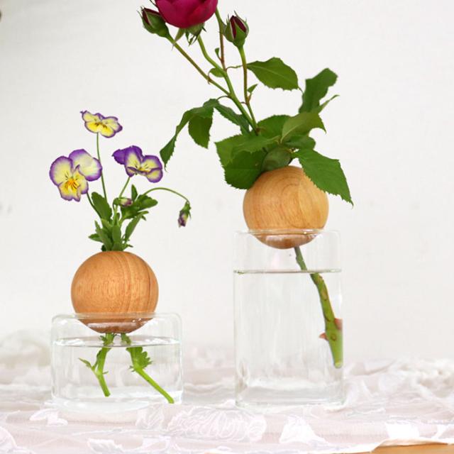 セットの木製玉は真ん中に空いた小さな穴がお花を支えて、一輪でも安定して生けられます。