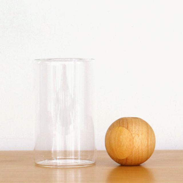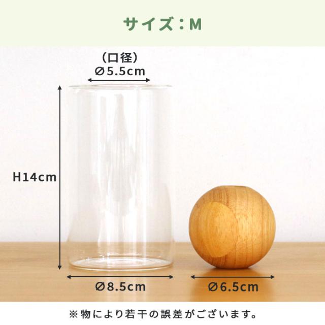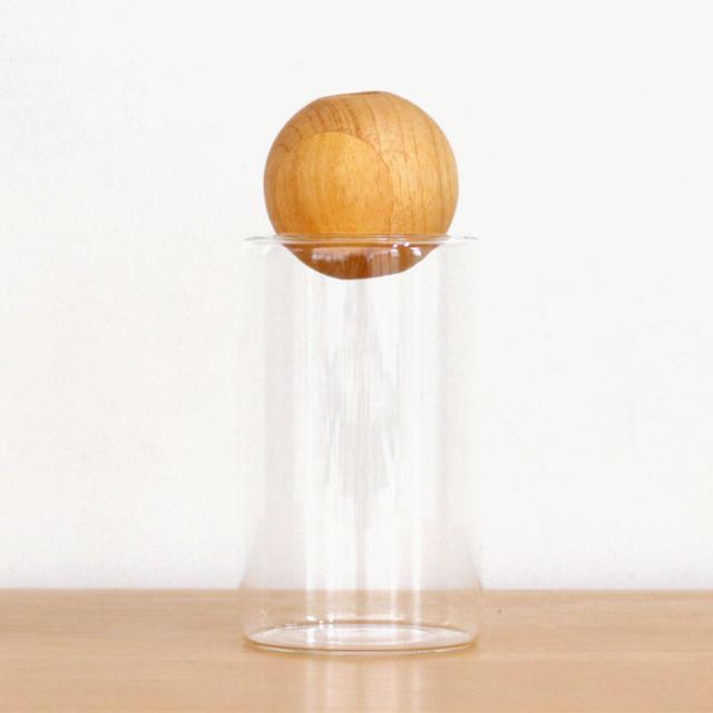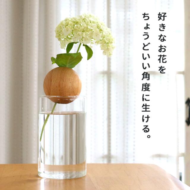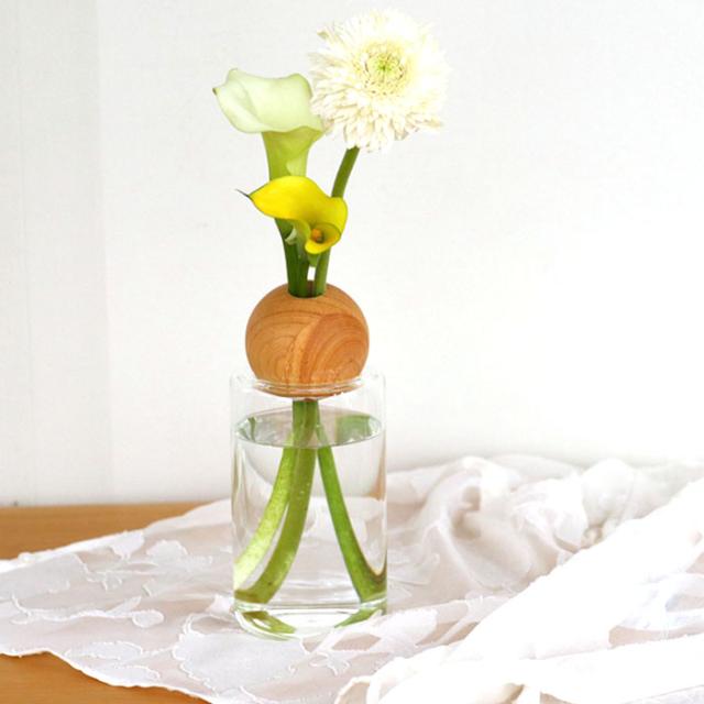 清潔に使える広々口径。 本体のガラス容器は、小さなブーケなども飾りやすい広々口径なので洗いやすくて清潔に使えるのも嬉しいポイント。 セットの木製玉は真ん中に空いた小さな穴がお花を支えて、一輪でも安定して生けられます。 |