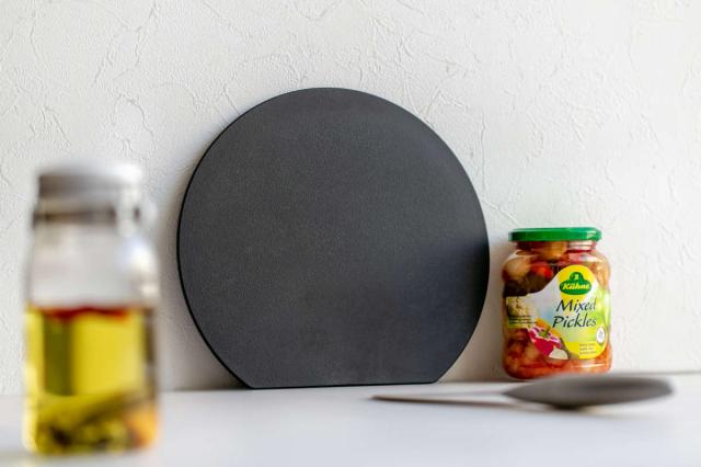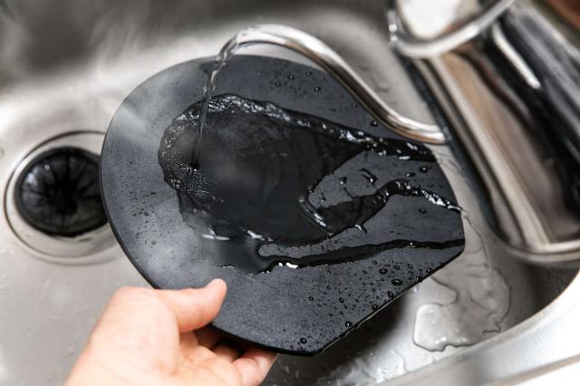 使い終わったら立てかけて乾燥ができます。厚さが約5mmと薄いので、立て掛けて置いても邪魔にならず、省スペースに収まります。食材を引き立てるシックなブラックカラーは、立てかけて置くだけでもキッチンに映えます。