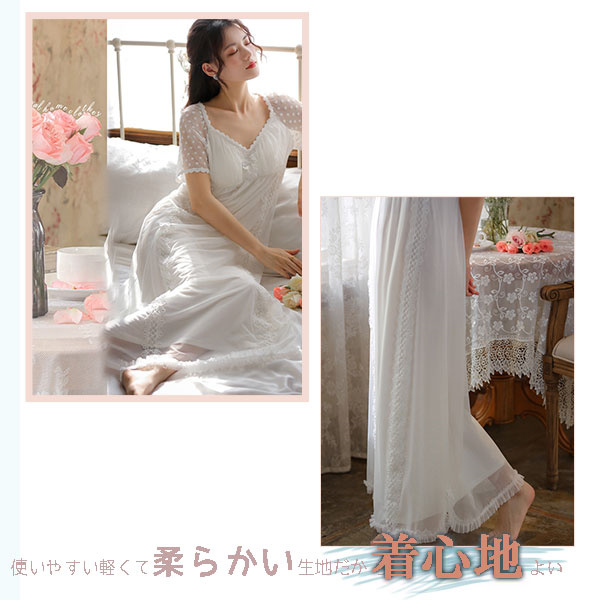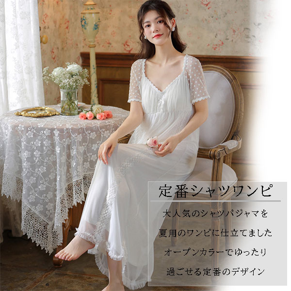 ルームウェア 半袖 レース 姫系 レディース フリル ネグリジェ ワンピース 夏 パジャマ ロング丈 体型カバー 部屋着 涼しい おしゃれ シンプル