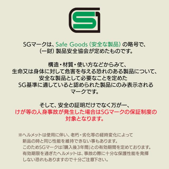 このヘルメットは(一財)製品安全協会が定めたSG基準に適合するヘルメットです。