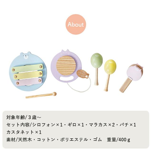 セット内容:シロフォン×1・カスタネット×1・ギロ×1・マラカス×2・バチ×1