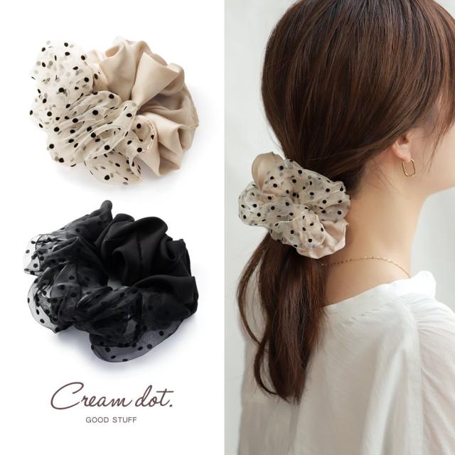 【ゆうパケットOK】シュシュ 大人 軽い ボリューム 大きめ ヘアアクセサリー 小物 ファッション雑貨 髪留め まとめ髪 異素材 サテン調 オーガンジー 透け感 ドット 水玉 大人 黒 ブラック ベージュ
