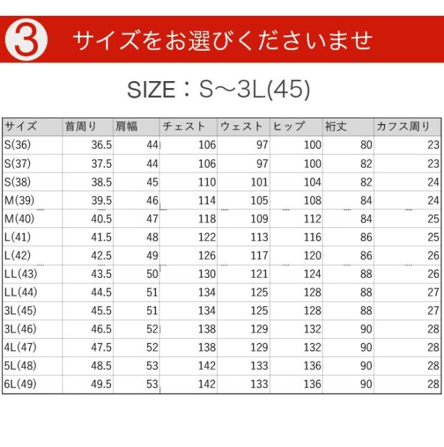| サイズ | 首周り | 肩幅 | チェスト | ウェスト | ヒップ | 裄丈 | カフス周り |