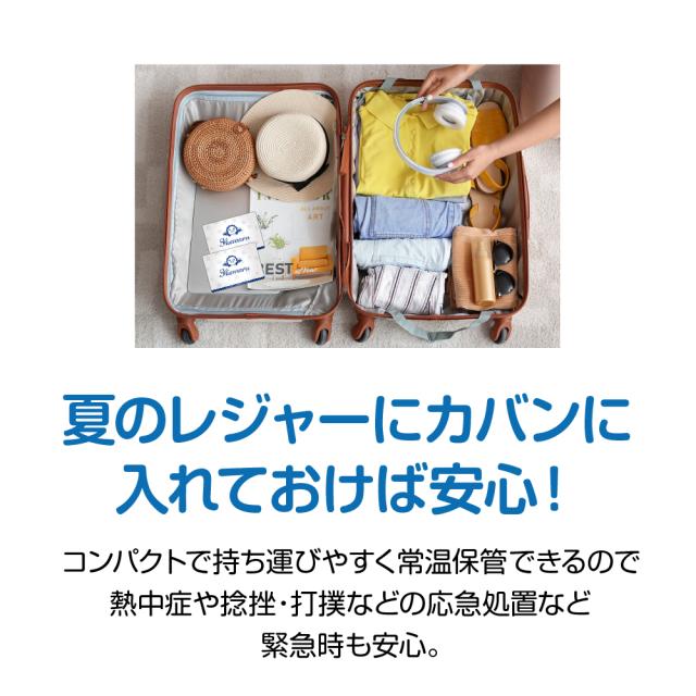 | パチン!!と叩くだけで、急速冷却。 スポーツ、レジャー時の暑さ対策に。 発熱、打撲、捻挫などの応急処置に。 |