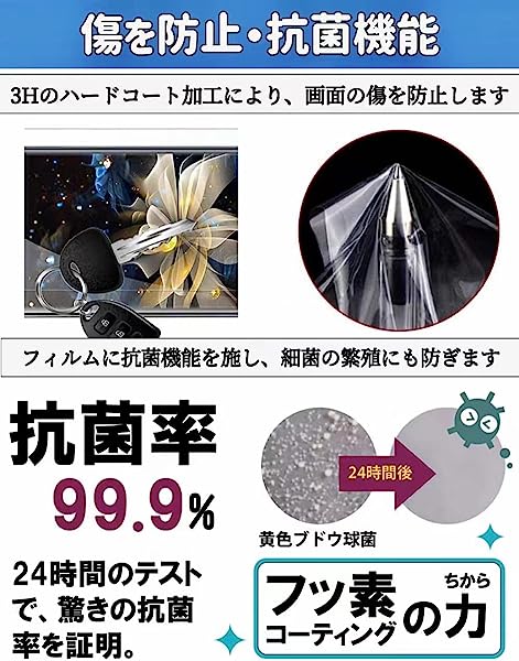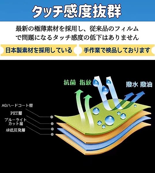 指紋防止 :フィルム表面の指紋防止加工により指紋や汚れが残りにくくなります。水や汚れ、油分をはじくため布などを用いて拭き取るだけで、画面をきれいな状態に保ちます