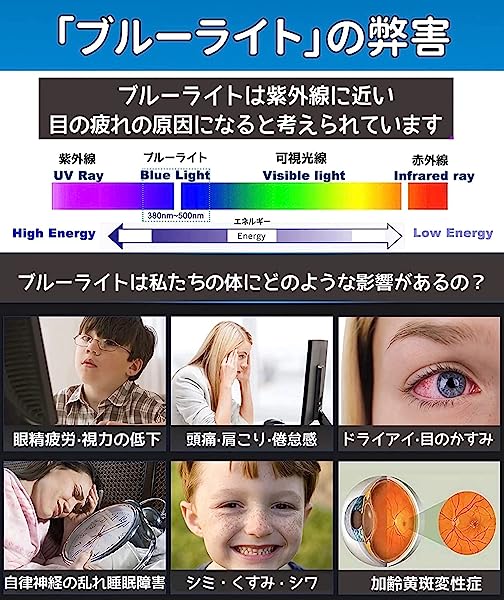 ブルーライトカット:ブルーライトは眼の疲れだけでなく身体に悪影響、頭痛、などの原因になります。こちらのフィルムは液晶画面から放出されるブルーライトがカットできます。さらに全光線透過率は高くて画面を見やすく、ブルーライトを効率的にカットするバランスを実現しました。対応機種本体の液晶画面を保護するだけでなく、目に影響を及ぼすブルーライトを色調を崩すことなく低減し、まぶしさやチラつきを抑えます。